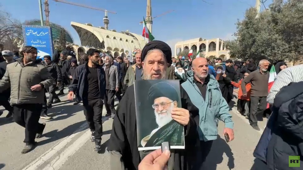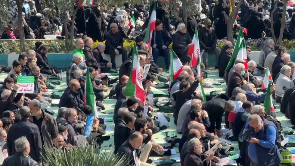 RT video footage showed crowds of men and women dressed in black, some carrying Iranian flags. Many worshippers held portraits of the assassinated supreme leader, chanted anti-US and anti-Israeli slogans and waved flags in support of their government amid the ongoing strikes.